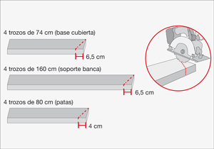 A los 4 trozos de 74 cm (base cubierta) cortar ambos extremos con un rebaje de 6,5 cm para formar la diagonal. Marcar en la parte inferior y trazar la diagonal hasta la esquina superior. A los 4 trozos de 160 cm (soporte bancas) hacer la misma diagonal a 6,5 cm. A los 4 trozos de 80 cm (patas) hay que hacerles un rebaje de 4 cm en diagonal, a cada extremo, para mantener la inclinación que tendrán las patas una vez armada.