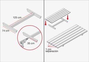 Fijar 2 trozos de 74 cm (base cubierta) con el corte de 125 cm (travesaño cubierta). Se fija a 35 cm desde el borde. Primero se avellana la madera y después se une con tornillos de 3”. Avellanar las tablas de 2 mt (superficie cubierta) y atornillar a la base de la cubierta, dejando 1 cm entre cada tablón. Son 2 tornillos por cada unión.