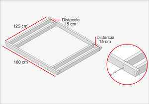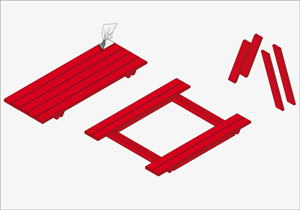 Las 2 bancas se arman juntas. Primero unir 2 trozos de 160 cm (soporte de las bancas) con los 4 cortes de 125 cm (travesaños bancas) ubicándolos de a par. Los travesaños se ubican justo donde comienza la diagonal, separados entre sí 15 cm. Se avellanan los trozos de 160 cm (soporte bancas) con 2 agujeros por cada unión, y se fija con tornillos de 3”.