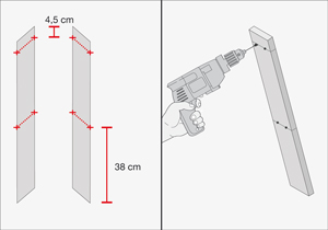 Con ayuda de la escuadra falsa, marcar 2 alturas en las patas donde irán las perforaciones para fijar las patas a las bancas y a la cubierta. La primera marca a va a 38 cm desde la base de las patas, y la segunda marca va a 4,5 cm desde la parte superior. Hacer estas marcas en las 4 patas. Para ubicar el lugar donde hay que hacer los 2 agujeros, se mide en la línea, 4 cm desde ambos bordes. Hacer estas 4 perforaciones con una broca paleta de 10 mm.