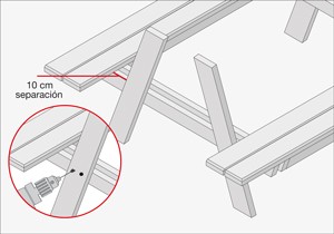 Fijar desde arriba las tablas de 2 mt (superficie bancas) atornillando a la base, con 2 fijaciones por cada tablón. Cada viga de 2x6” se separa 1 cm. Dar vuelta la estructura de bancas y fijar el segundo par de trozos de 160 cm (soporte bancas) a 4,5 cm de distancia de los que se pusieron primero. Estas vigas se fijan desde el canto de la diagonal a la base.